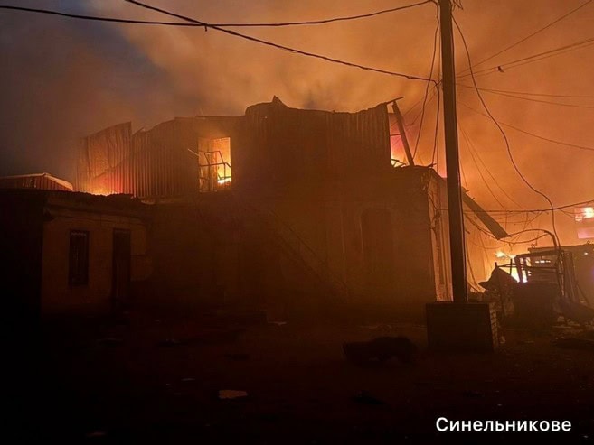 Як повідомляє Дніпропетровська обласна рада, російські військові атакували місто опівночі. Внаслідок масованого удару БпЛА у Синельниковому загинула людина. Поранена 42-річна жінка й хлопчик 12 років. Горіла адміністративна будівля й торгівельний комплекс. Пошкоджені 4 багатоквартирні будинки, 6 приватних осель, 7 господарських споруд, транспортне підприємство, 10 автобусів й авто.
