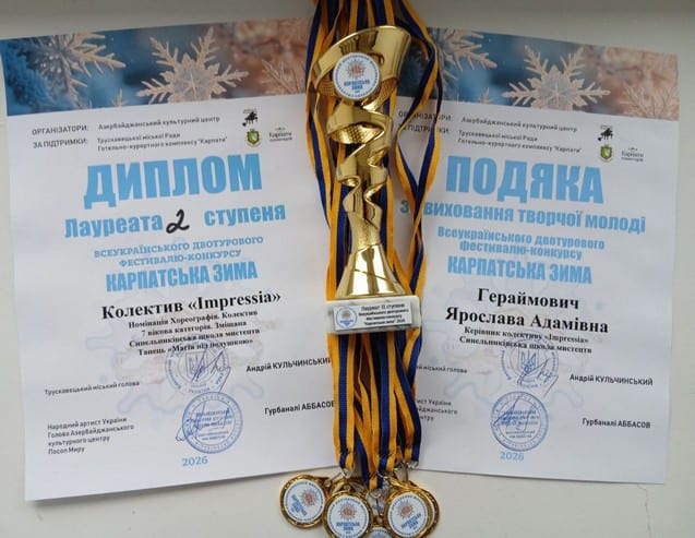 Колектив «Impressia» (керівник Ярослава Гераймович) прийняв участь у Всеукраїнському двотуровому фестивалі-конкурсі «Карпатська зима» (м.Трускавець) та отримали диплом лауреату ІІ ступеня.