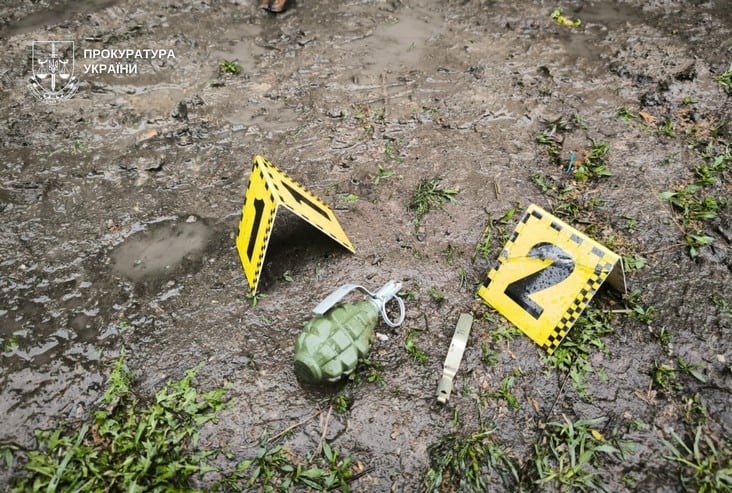Під час огляду місця події правоохоронці вилучили предмет, схожий на гранату, запал та інші частини гранати. Вилучені речові докази направлено на експертизу.
